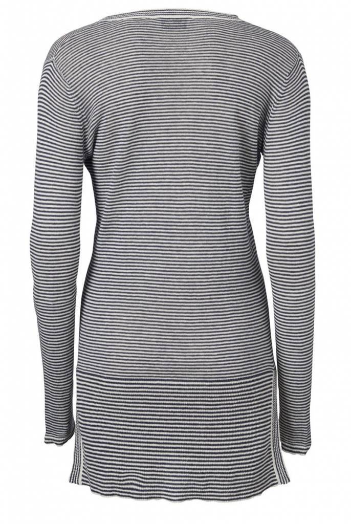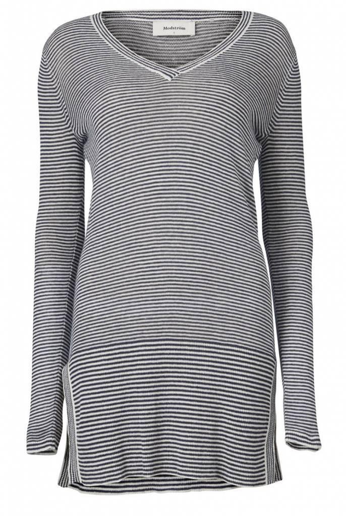 Long V-Neck jumper Shawn from Modstrom. The Shawn V-Neck in Navy Sky Off White (off white with a striped pattern in navy) has a v-neck and long sleeves. The jumper is fine knitted and made of semi-sheer, lightweight cotton and linen. The neckline, cuffs and hem are ribbed and the hemline is finished with slits at the sides. The Shawn V-Neck jumper has a straight fit and effortless appeal.