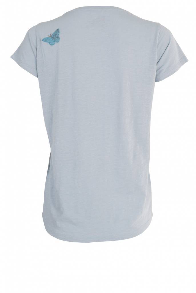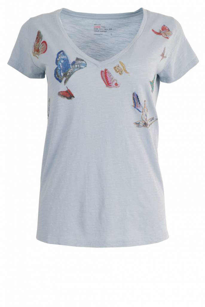 T-Shirt with a print and adornment Tintin Butterfly JC03 from Leon & Harper. The JC03 in Bleuet (light blue) has a deep v-neck, short sleeves and a relaxed fit. The T- shirt is adorned with printed butterflies. The print is adorned with embroidery and sequins. The Tintin Butterfly has playful and quirky appeal.
