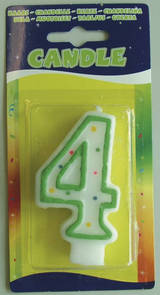 Verjaardagskaars cijfer 4 - wit met gekleurde stippenEen vrolijke verjaardag taartkaars in de vorm van het cijfer 4. € 2,99 verzendkosten Gratis verzending vanaf € 50,00 Voor 14.00 uur besteld, vandaag verstuurd