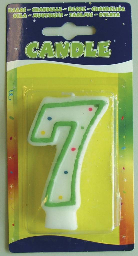 Verjaardagskaars cijfer 7 - wit met gekleurde stippenEen vrolijke verjaardag taartkaars in de vorm van het cijfer 7. € 2,99 verzendkosten Gratis verzending vanaf € 50,00 Voor 14.00 uur besteld, vandaag verstuurd