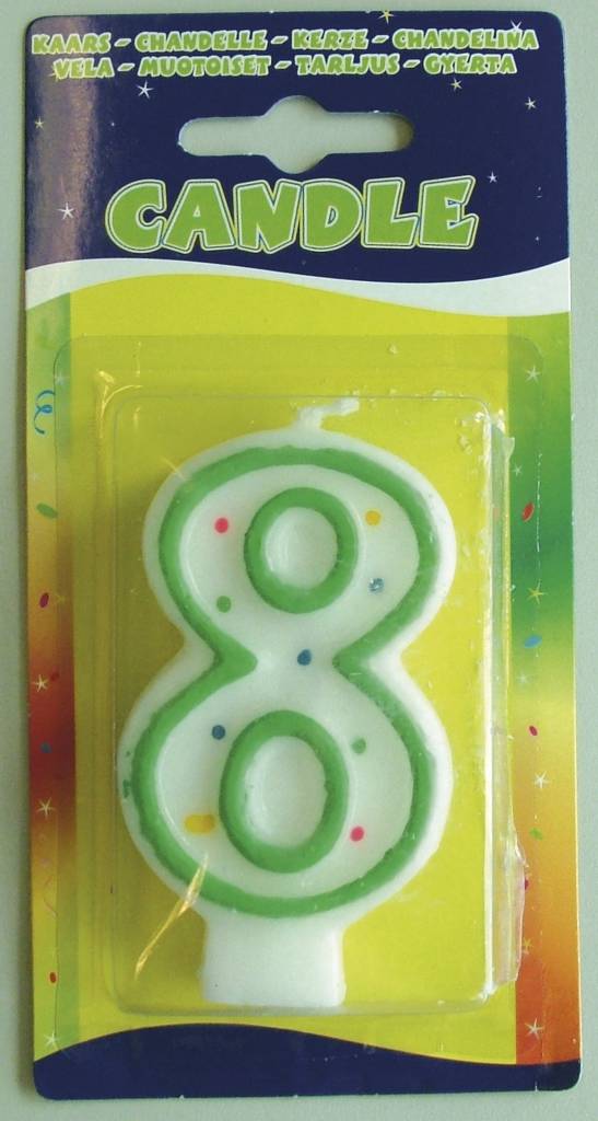 Verjaardagskaars cijfer 8 - wit met gekleurde stippenEen vrolijke verjaardag taartkaars in de vorm van het cijfer 8. € 2,99 verzendkosten Gratis verzending vanaf € 50,00 Voor 14.00 uur besteld, vandaag verstuurd